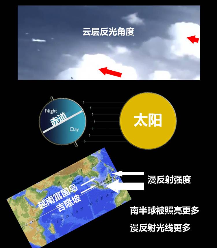 其次,由于3月8日,太阳的直射点偏向南半球(3月21日前后,太阳直射点才会从南半球移动到赤道0°)。所以大气层反射及漫反射光线,东南部角度更强烈。这些漫反射光线,在夜视仪器下,会增亮,犹如白天。视频中云层的反光角度吻合这点。见上图。