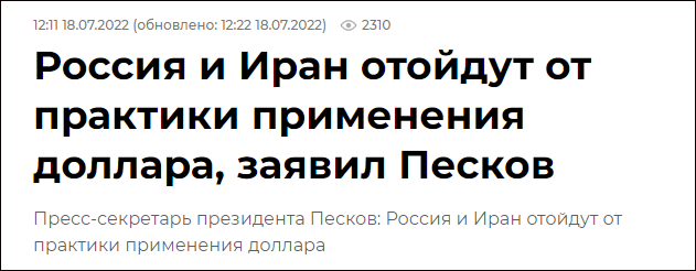 从新闻看,议程不少,最醒目有这么一条:俄罗斯和伊朗将在交易中放弃使用美元。